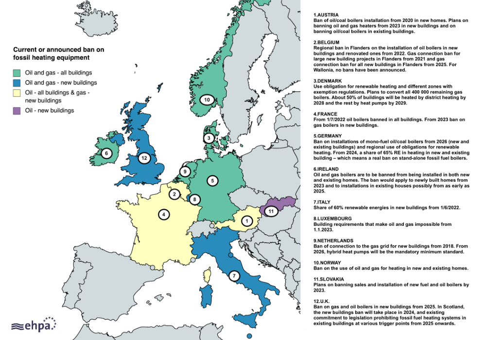 Aktualizace evropské směrnice o energetické náročnosti budov z roku 2021 uvádí, že od roku 2030 by mělo dojít k zákazu jejich instalace kotlů na fosilní paliva v nových objektech. Do roku 2040 je pak vyžadováno, aby členské státy předložily plán pro postupné vyřazení fosilních paliv z vytápění a chlazení.